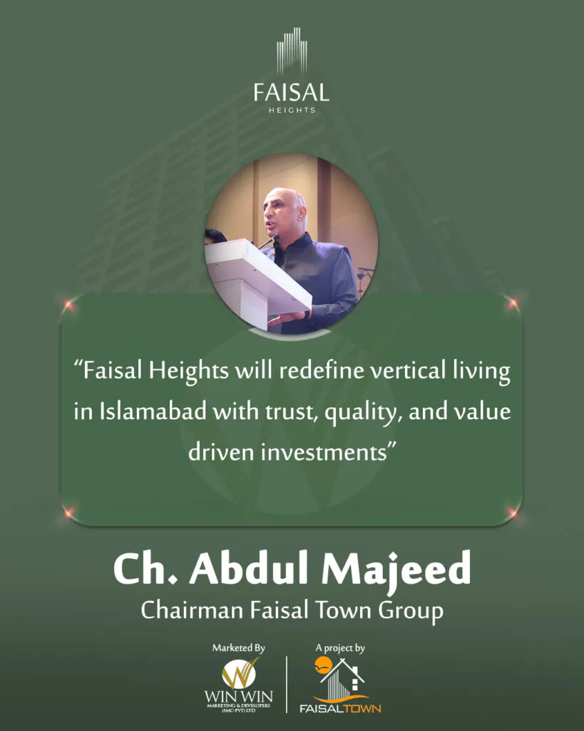 Faisal Heights, Islamabad, is a mid-rise apartment project located in Faisal Town Phase 1, developed by Zedem International under the leadership of Chaudhary Abdul Majeed. Positioned just off the Kashmir Highway and a few minutes from Islamabad International Airport, the location connects easily to key areas of the twin cities.